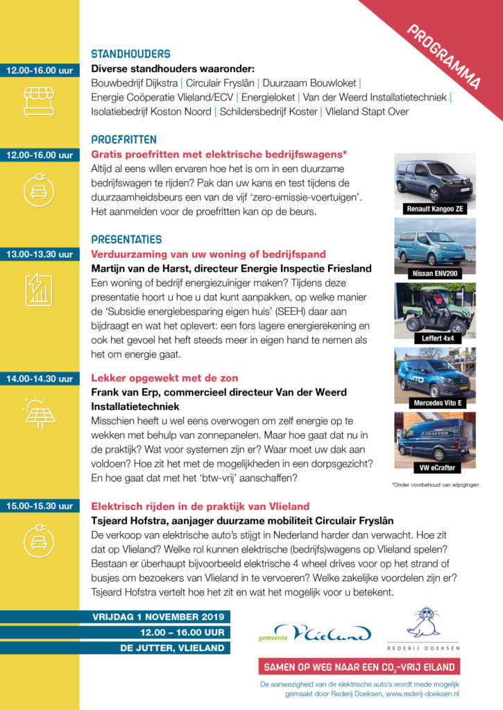 Op vrijdag 1 november a.s. van 12:00 uur tot 16:00 uur wordt in De Jutter op Vlieland ‘Dé Duurzaamheidsbeurs’ gehouden.