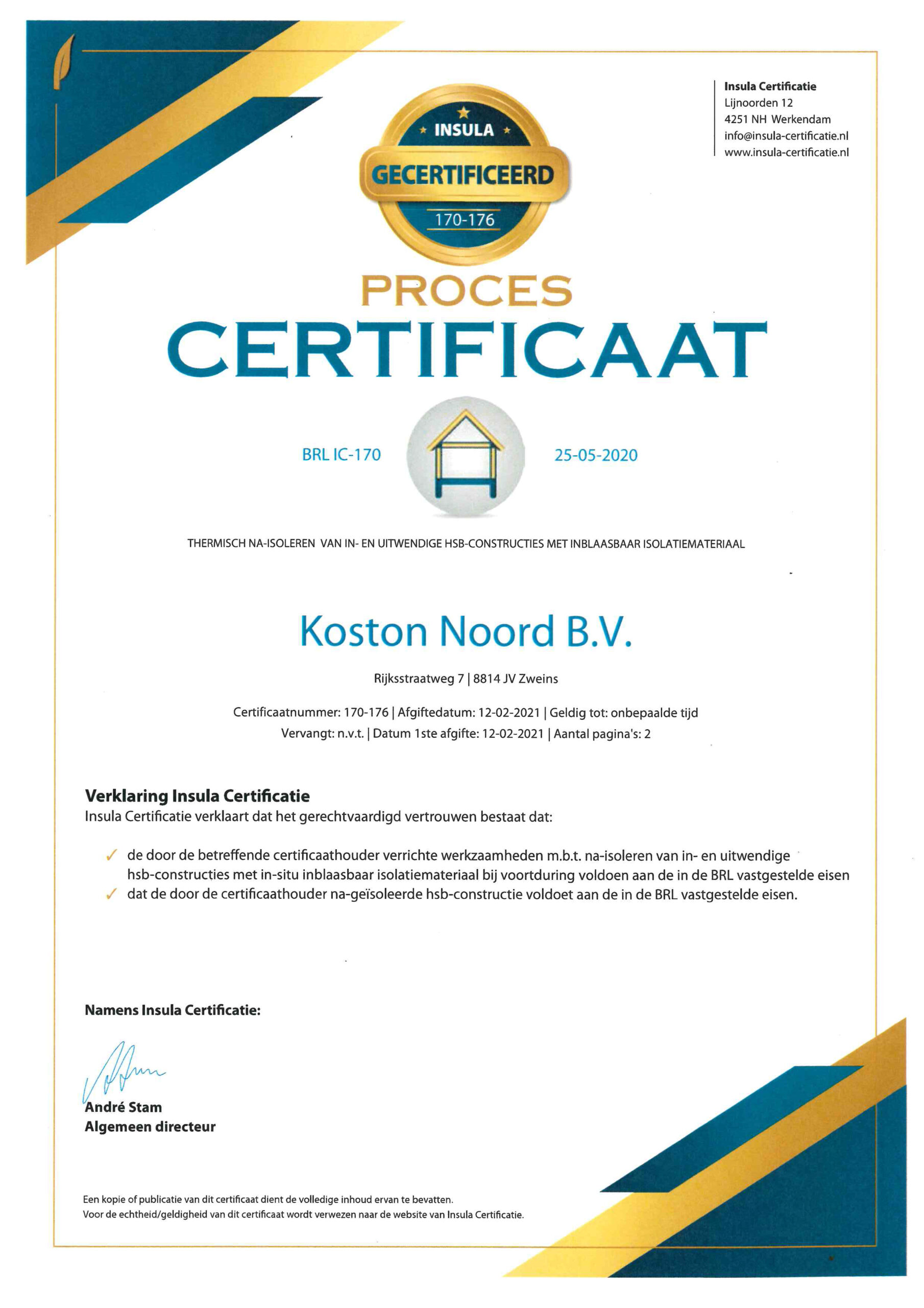 Koston Noord is op 12 februari, als eerste isolatiebedrijf in Nederland gecertificeerd voor het thermisch na-isoleren van in- en uitwendige HSB constructies met inblaasbaar isolatiemateriaal.